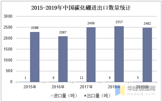 2015-2019年中國(guó)碳化硼進(jìn)出口數(shù)量統(tǒng)計(jì)