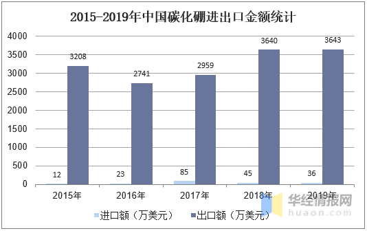 受美國(guó)市場(chǎng)萎縮影響甚至略有減少,但隨著國(guó)內(nèi)需求的快速增長(zhǎng),出口占比將逐年下降,預(yù)計(jì)未來(lái)將延續(xù)這一趨勢(shì)。據(jù)統(tǒng)計(jì),2019年我國(guó)碳化硼出口金額為3643萬(wàn)美元。