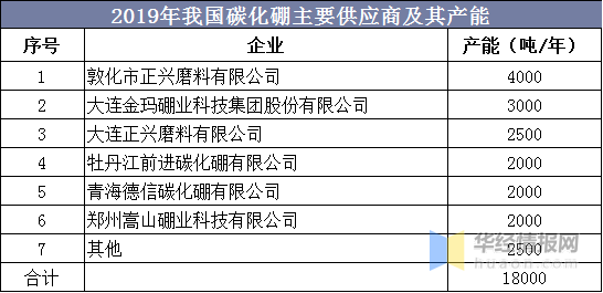 2019年我國(guó)碳化硼主要供應(yīng)商及其產(chǎn)能