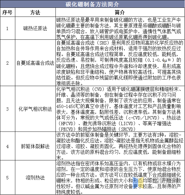 碳化硼早在1934年便被發(fā)現(xiàn),通過(guò)幾十年的研究,人們對(duì)碳化硼的結(jié)構(gòu)及基本性能已熟知。但航空航天、核工業(yè)、電子信息等領(lǐng)域的迅速發(fā)展,對(duì)材料性能提出了更高的要求,進(jìn)一步挖掘碳化硼的應(yīng)用價(jià)值、拓展其應(yīng)用領(lǐng)域仍有重大意義。目前碳化硼常用的制備方法有碳熱還原法、自蔓延高溫合成法、化學(xué)氣相沉積法、前驅(qū)體裂解法、溶劑熱法: