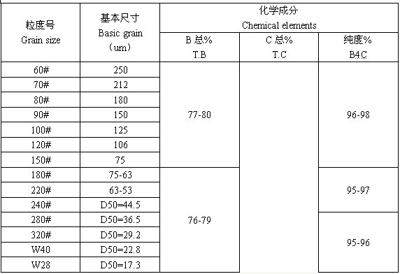 碳化硼是最硬的人造磨料之一,硬度僅次于金剛石,其硬度為9.36,研磨效率高,適用于各種硬質(zhì)合金,寶石等材料的研磨、拋光、鉆孔等加工,是金剛石的理想代用材料。碳化硼也是工程制品,耐火材料,特殊焊接的主要原料,可制成耐磨焊條、各種高級(jí)快速切削刀具和耐磨程度極高的磨具、噴砂嘴、密封環(huán)和精密量元件等。碳化硼比重2.52g/cm3.熔點(diǎn)2450度,耐高溫與堿不起反應(yīng),具有吸收中子和半導(dǎo)體導(dǎo)電性質(zhì),是制造硼化鈦等金屬硼化物,硼鋼和核工業(yè)中子吸收劑等不可缺少的材料。